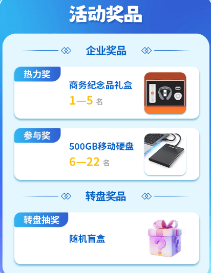 本次活动按照“热力值”由高到低排名,“热力值”相同的情况下,更早达到该票数的企业排名靠前。票数排名前五的企业将获得“热力奖”,其余参赛企业均获得“参与奖"。 奖品将在国庆假期后一周同意发放。