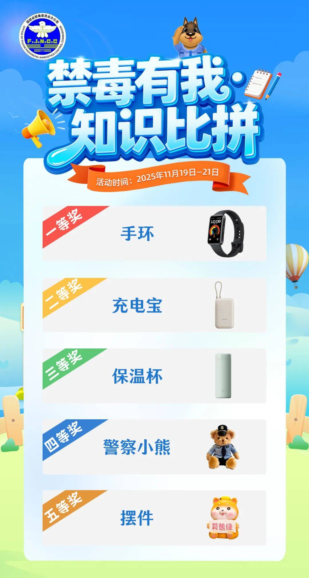 为大力推进全GF范青少年 滥用涉麻精药品等成瘾性物质宣传教育 增强公众识毒防毒拒毒意识和能力 “禁毒有我 知识比拼” 禁毒知识线上答题有奖活动 11月19日-11月21日上线啦! 边学禁毒知识,边赢惊喜好礼 共同守护无毒人生 活动时间 2025年11月19日—11月21日 参与方式 关注“福建禁毒”微信公众号 活动奖品 活动须知 1.活动时间:2025年11月19日—11月21日。 2.活动期间,每位用户每日拥有3次抽奖机会,答对6题即可参与抽奖。 3.中奖用户需填写手机号、收件人、收件地址等信息用于领取奖品。 4.提交兑奖信息即为成功兑奖,无效手机号不兑奖,兑奖信息不支持修改;兑奖信息提交时间截至11月21日24:00前,逾期视为放弃奖品。 5.奖品以实物为准,实物奖品将在活动结束后10个工作日内完成发放。 6.经核实,以非法技术手段操作的获益部分均无效。 7.法律允许范围内,福建禁毒微信公众号拥有对此活动的最终解释权。 此次活动题目均出自 2025年全国青少年知识竞赛题库 就藏在“福建禁毒”公众号 底部菜单栏—“禁毒教育”专栏 一般人可不告诉TA哦~ 注:来源:福建禁毒,想了解更多资讯请关注!