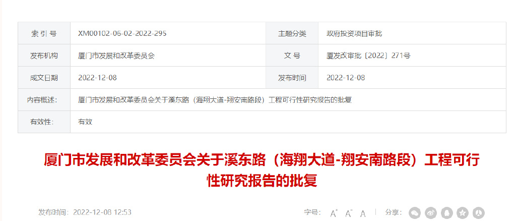 厦门市公路事业发展中心: 你单位《立项用地阶段审批申请表》收悉。经研究,同意你单位建设溪东路(海翔大道-翔安南路段)工程(投资项目在线审批监管平台项目代码:2103-350213-04-01-404238),具体批复如下: 一、主要建设内容及规模 项目位于翔安区,起于既有海翔大道,终于既有翔安南路,路线全长4.94公里,按城市快速路标准建设,主线双向6车道,辅道双向4车道,路幅宽60米。其中:跨西林湖设大桥一座,长473米,按双幅布设,单幅净宽24.5米;与海翔大道交叉设溪边后互通一座,主线长1公里,匝道总长9.38公里;完善与翔安南路互通立交(茂林互通),主线长534米,匝道总长879米。 主要建设内容包括:道路、桥梁、下穿通道、市政管线、照明、交通及绿化等工程。 二、总投资估算及资金来源 项目总投资估算110939万元(不含征地拆迁费、管线迁改费和土地使用成本)。 三、其他事项 1.项目前期工作有效期二年。 2.接文后,请按照以上批复内容,抓紧开展项目初步设计编制等前期工作,初步设计及概算书编制完成后,报我委审批投资概算。项目投资概算批复后,方可开展项目招投标工作。 3.按照《厦门市政府投资项目后评价管理办法(试行)》(厦发改稽查〔2009〕1号)规定,项目列入后评价管理。